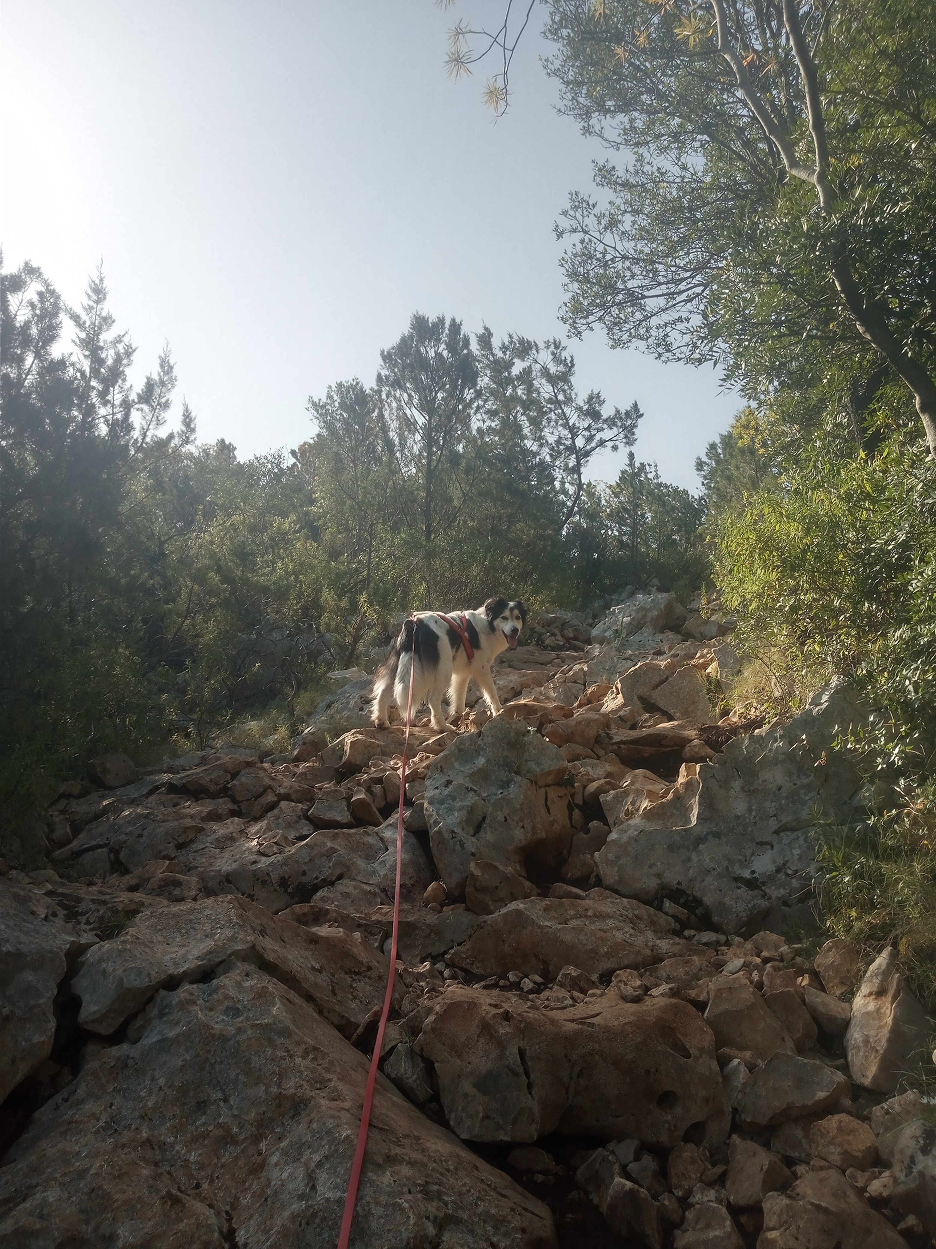 Wir sind nicht so weit gefahren. Bis zur Cala Fuili. Dort hat Frauchen parkiert und wir sind zu Fuss los. Jetzt hat's mir doch langsam gefallen! :-) Erst ging's runter und dann auf der andern Seite gleich wieder hoch. War ziemlich steinig und steil der Weg. Ok, ich glaube, es war besser, dass Lara nicht mitgekommen ist! Es ging immer mal wieder hoch, runter, gerade aus usw. Einmal kamen wir noch bei einer Grotte vorbei.